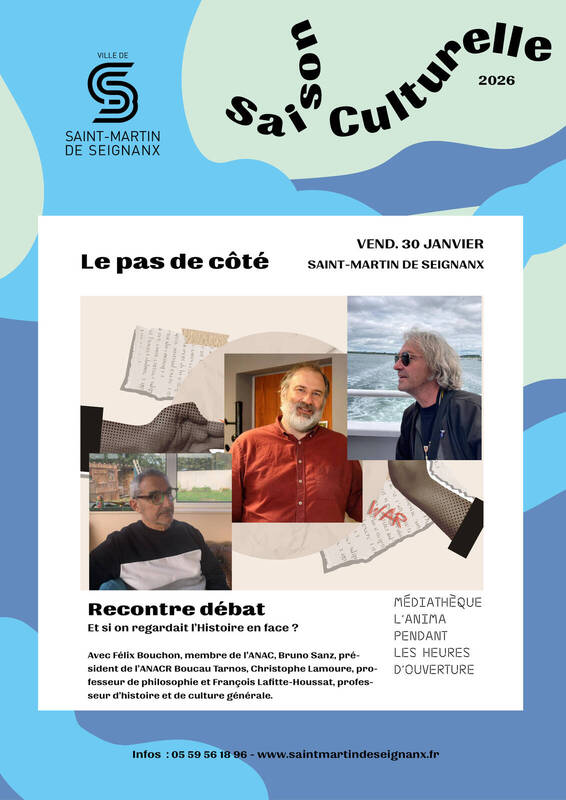 Félix Bouchon, membre de l’Association Nationale des Anciens Combattants et amis de la Résistance (ANACR)animera les échanges entre Bruno Sanz, président de l’ANACR Boucau Tarnos, Christophe Lamoure, professeur de philosophie et François Lafitte-Houssat, professeur d’histoire et de culture générale. Ils se retrouvent pour s’interroger ensemble autour de cette question : y a-t-il des éléments de l’histoire qui doivent nous alerter ? À quel moment réagir ? Comment tirer les leçons de l’Histoire et résister à des évènements face auxquels nous nous sentons parfois bien impuissants ?...