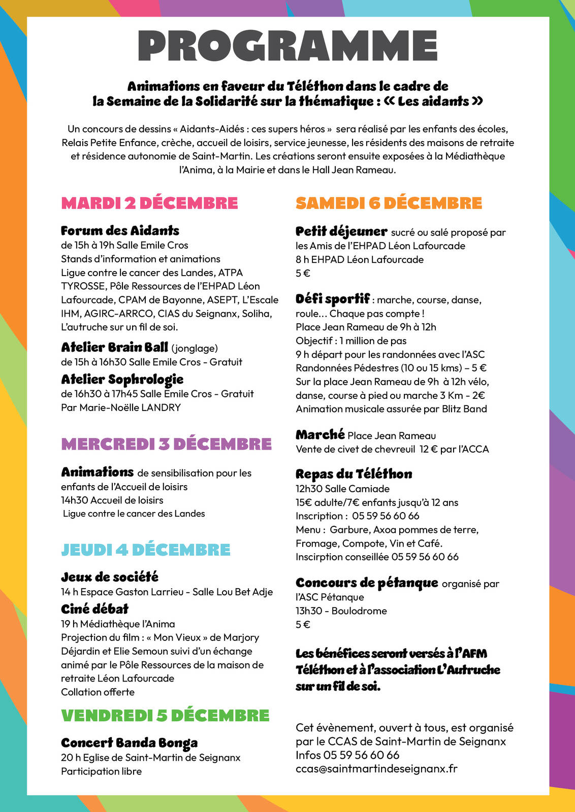 Retrouvez les animations proposées dans le cadre du grand rendez-vous solidaire organisé en faveur du Téléthon à Saint-Martin de Seignanx. Organisé du 2 au 6 décembre par le Centre Communal d'Action Social en lien avec les associations locales la thématique de cette année mettra en valeur les aidants qui œuvrent aux côté des personnes vulnérables tout au long de l'année.