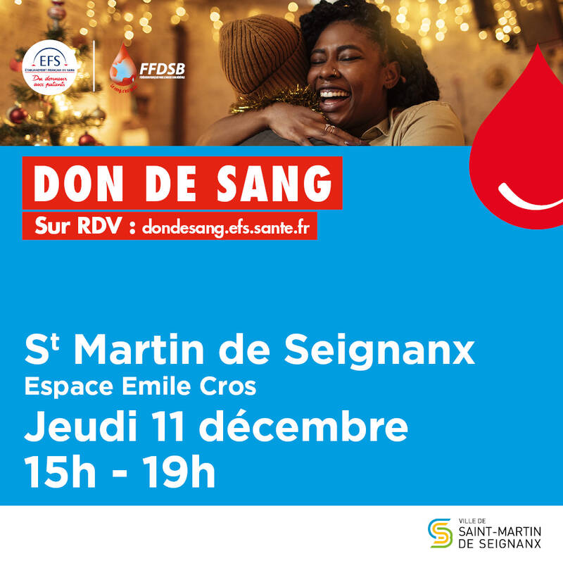 La prochaine collecte à Saint-Martin de Seignanx se tiendra jeudi 11 décembre re de 15h à 19h salle Emile Cros.